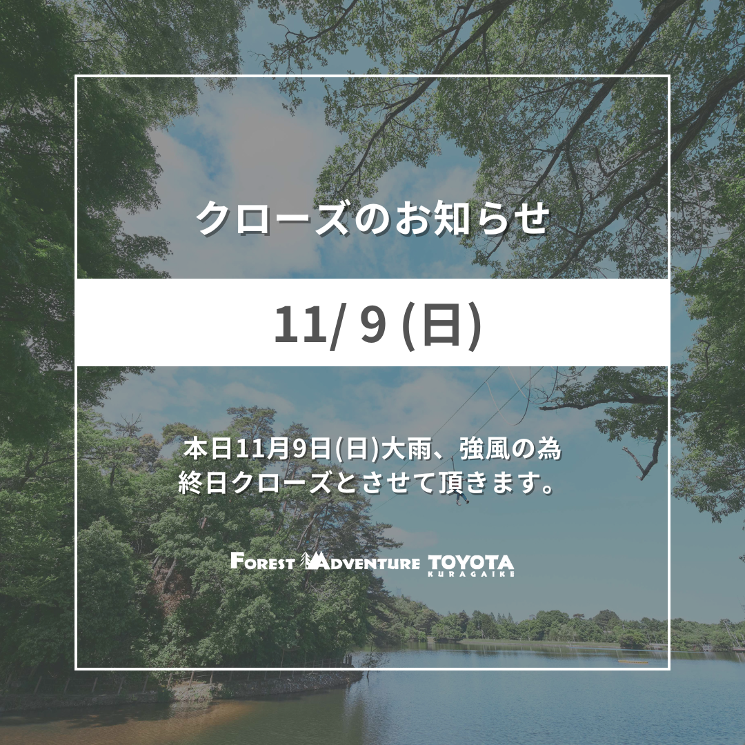本日11/9(日)は、大雨、強風の為、終日クローズとさせて頂きます。